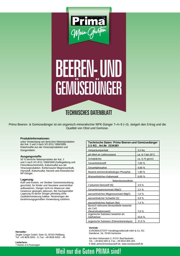 Prima Beeren- & Gemüsedünger ist ein organisch-mineralischer NPK-Dünger 7+4+9 (+3), steigert den Ertrag und die Qualität von Obst und Gemüse.