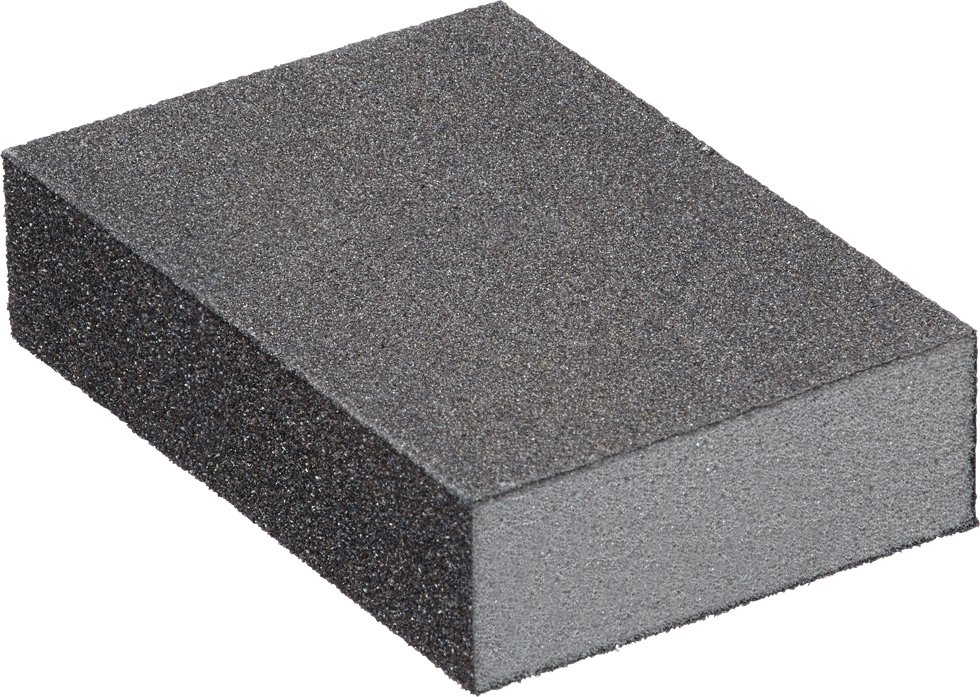 Schleifschwamm, 4-seitig aluminiumoxidbestreut, 100 x 70 x 26 mm, Korund, je eine Schmalseite und eine breite Fläche in Einfachkörnung, 2-fach Körnung für Schwamm, Träger hochflexibler Polyurethan-Schaum, kunstharzgebunden, trocken und nass einsetzbar.
