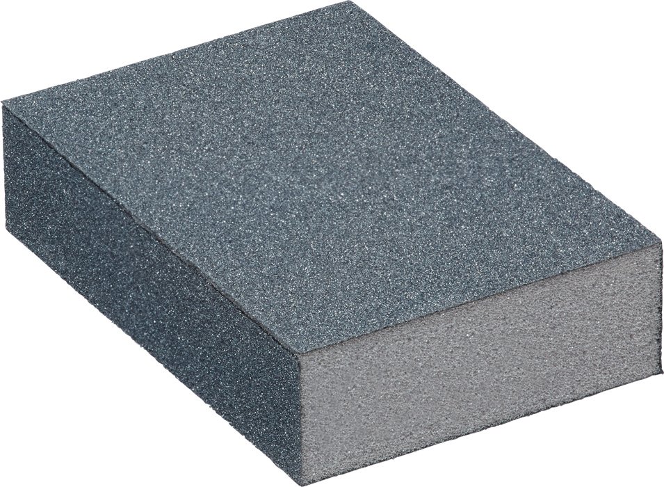 Schleifschwamm, 4-seitig bestreut, 100 x 70 x 26 mm, Siliziumcarbid, je eine Schmalseite und eine breite Fläche in Einfachkörnung, 2-fach Körnung für Schwamm, Träger hochflexibler Polyurethan-Schaum, kunstharzgebunden, trocken und nass einsetzbar.