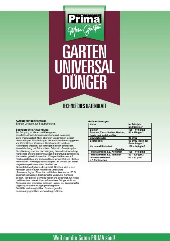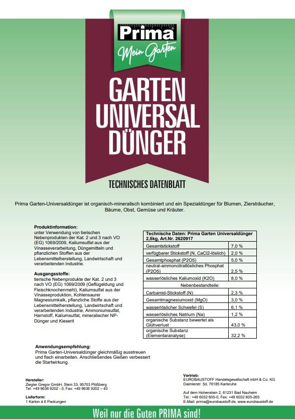 Prima Garten-Universaldünger ist ein organisch-mineralischer NPK-Dünger 7+5+8 (+3), ausgewogene Düngermischung.