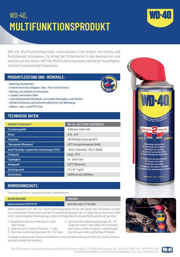 Millionen von Anwendern in aller Welt schwören auf den legendären Allrounder. Der Grund für den Erfolg des WD-40 Multifunktionsprodukts ist kein Geheimnis: Es löst so gut wie jedes Wartungs- und Reparaturproblem. Extreme Vielseitigkeit und konstante Zuverlässigkeit sind hier Programm.