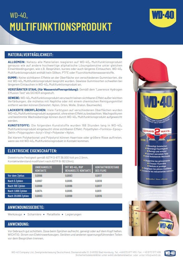 Beseitigt Quietschen: Eines der Hauptkomponenten ist ein aktives Schmiermittel, welches die Gängigkeit beweglicher Teile erleichtert und gleichzeitig Quietschen und Knarren beseitigt. Darüber hinaus schmiert es Teile und Mechanismen.