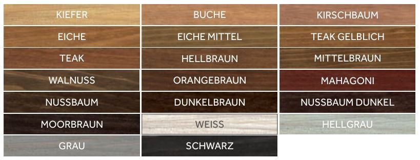 Die natürliche Holzmaserung wird betont. Alle Farben sind auch untereinander mischbar.