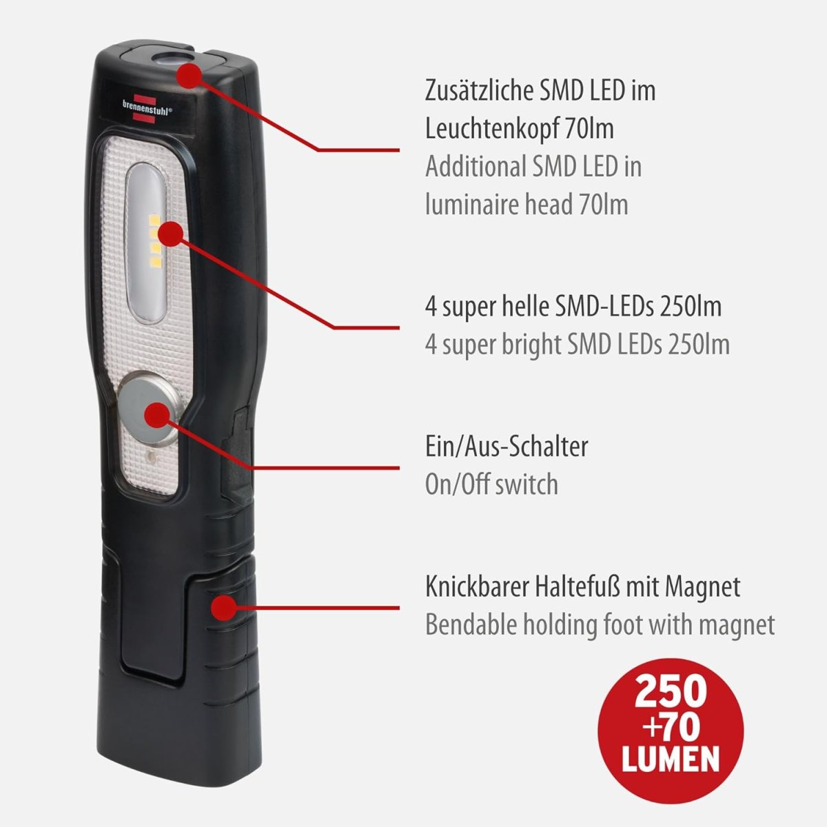 - Die Werkstattleuchte scheint extra hell, großflächig und gleichmäßig dank 4 superheller SMD-LEDs (250lm) und einer zusätzlichen SMD-LED im Leuchtenkopf (70lm)