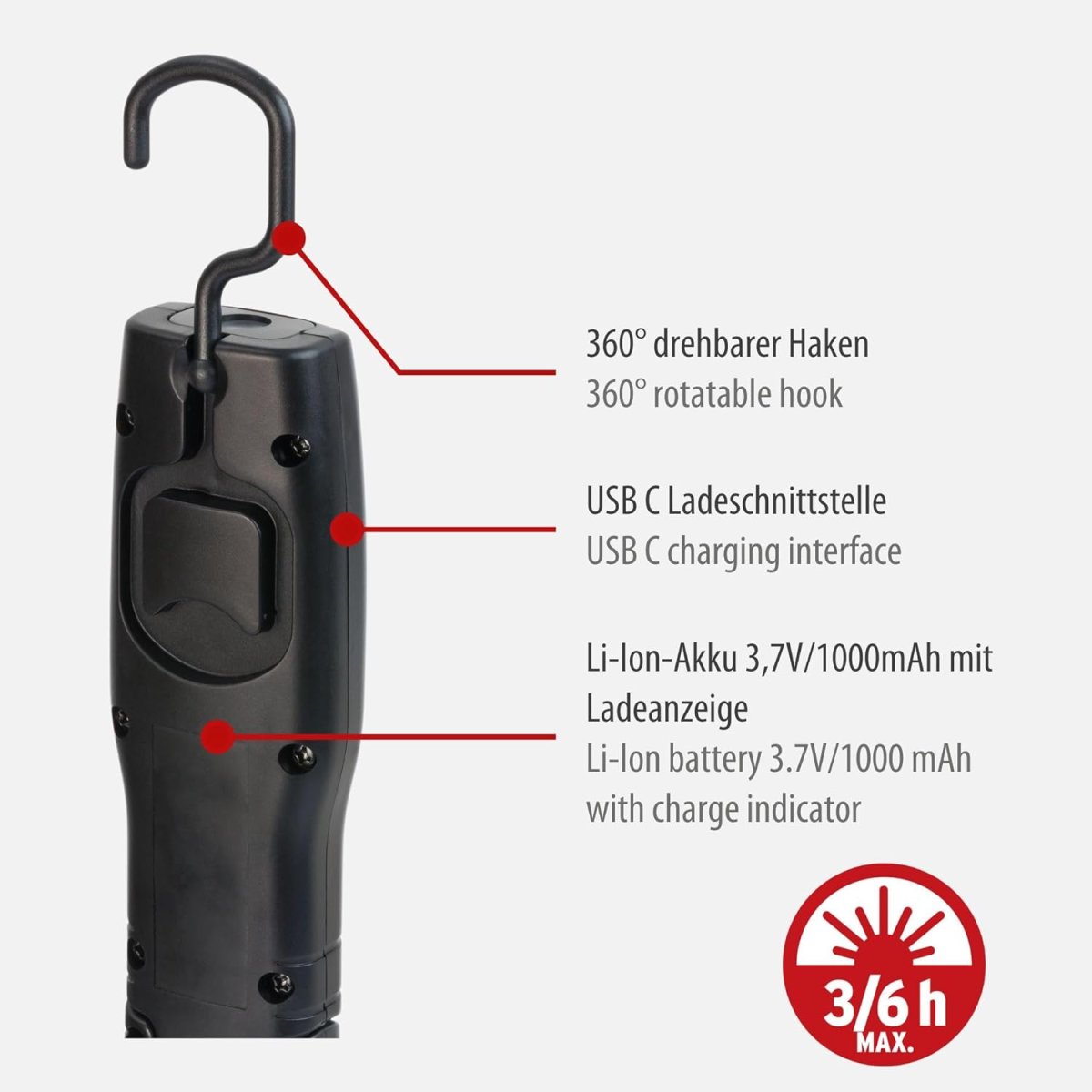 - Akku LED Arbeitsleuchte lässt sich über den Ein/Aus Schalter bedienen und über das mitgelieferte USB C Ladekabel bequem aufladen - mit einer max. Leuchtdauer von 3h für das Hauptlicht und max. 6h für die zusätzliche Lichtquelle im Leuchtenkopf