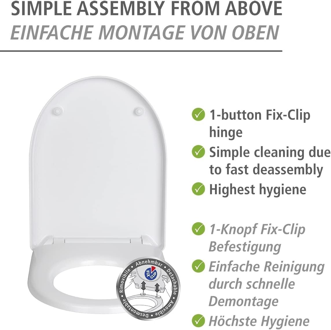 Auch die Montage und Reinigung des Sanitär-Zubehörs punktet mit vorteilhaften Eigenschaften. Die hygienische 1-Knopf Fix-Clip Edelstahl-Befestigung geht einfach von der Hand, ist rostfrei und bei der Reinigung erreichen Sie durch einfaches Abnehmen des WC-Sitzes alle Stellen.