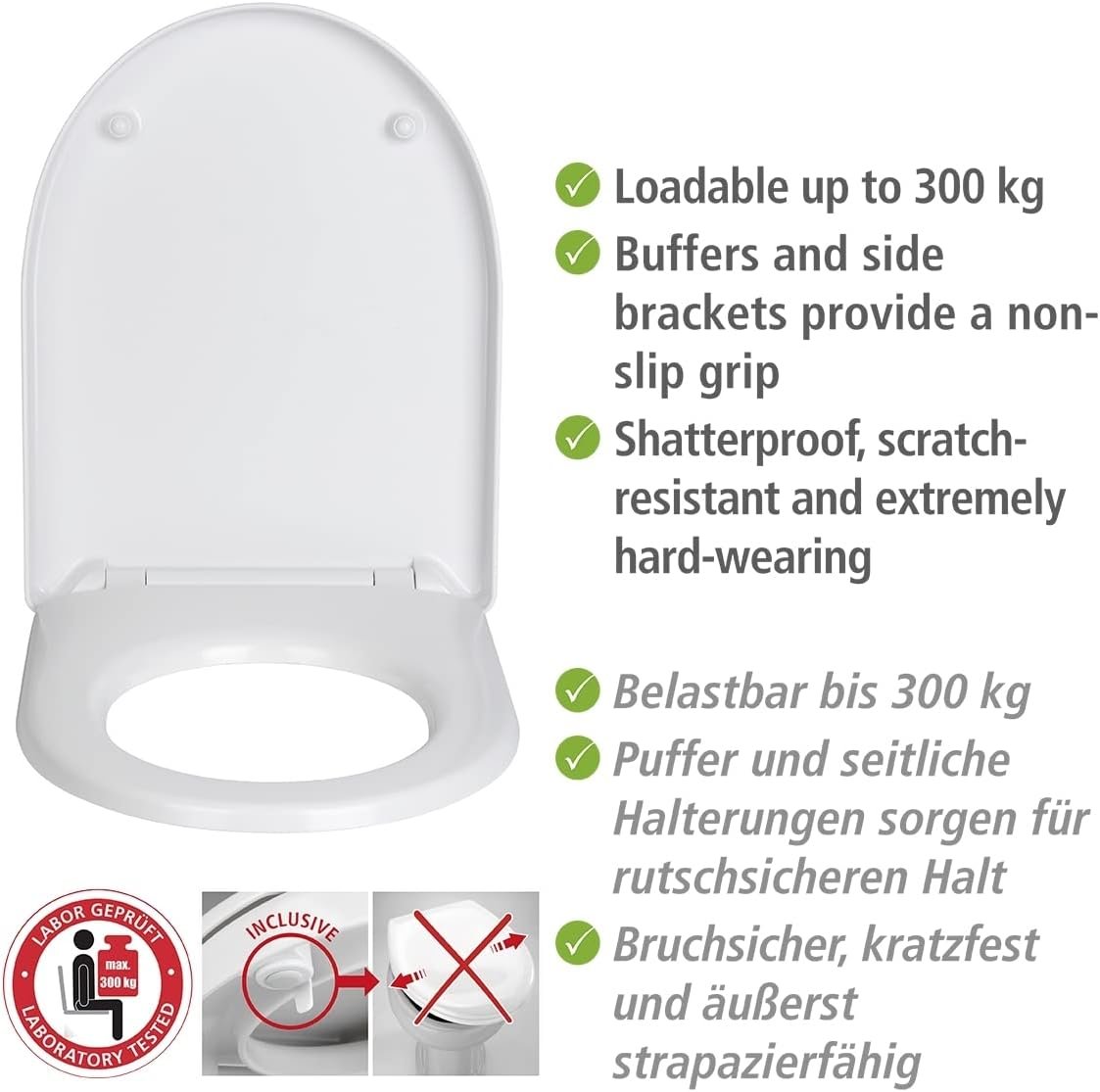 Wohl geformt und absolut robust zieht mit dem Toilettensitz Sindia von WENKO ein hochwertiger WC-Sitz bei Ihnen ein, dessen Belastbarkeit von 300 kg durch ein akkreditiertes Labor bestätigt ist.
