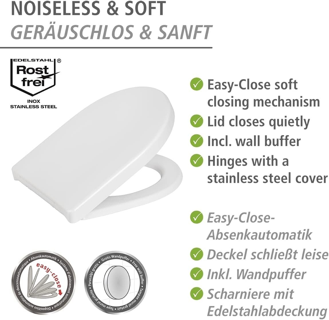 Neben der hohen Belastbarkeitsgrenze und der Fertigung aus kratzfestem Material ist der WC-Sitz Sindia mit der bewährten Easy-Close Absenkautomatik ausgestattet. Lautes Deckel knallen gehört damit der Vergangenheit an, denn der Deckel schließt ganz sanft und leise.