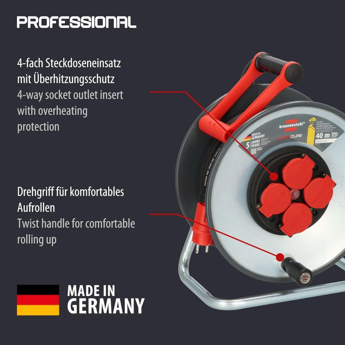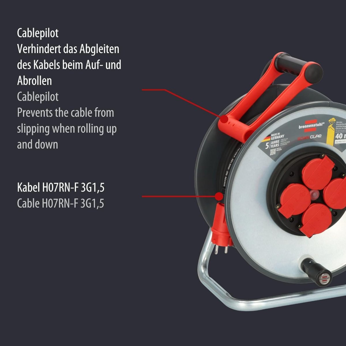 Die Professional 40m Kabeltrommel mit einem Trommelkörper aus Stahlblech, welcher kälteschlagbeständig bis -25 °C ist, eignet sich perfekt für den ständigen professionellen Einsatz in Außenbereichen. Das ölbeständige RN Kabel ist extrem robust und unempfindlich gegen Benzine. Die Kabeltrommel mit 4 spritzwassergeschützten Schutzkontakt-Steckdosen verfügt über einen Überhitzungsschutz mit Kontrollleuchte bei Überhitzung und Überlastung und einer optischen Bereitschaftsanzeige im Steckdoseneinsatz. Der innovative Tragegriff "cablepilot" sorgt für eine perfekte Kabelführung, er ermöglicht ein Pendeln auf beiden Seiten und zudem bequemes Tragen und Aufhängen. Die Profi-Kabeltrommel überzeugt weiterhin durch folgende Eigenschaften: