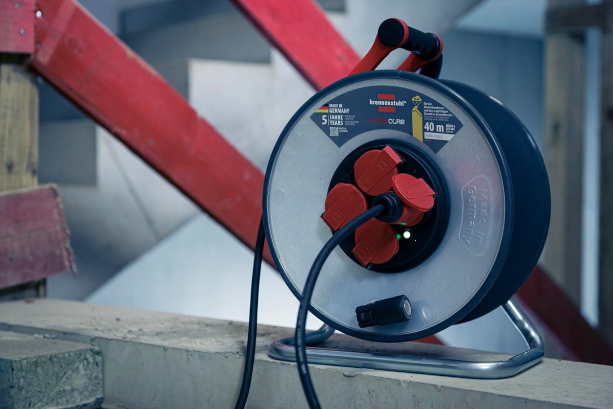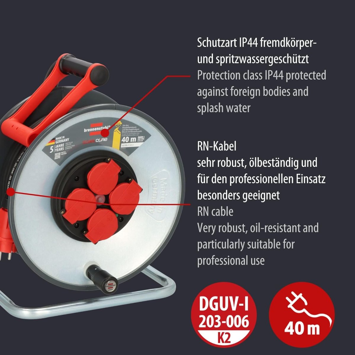 - Kabeltrommel mit robustem RN-Kabel (ölbeständig) und Schutzart IP44 - ideal für den ständigen professionellen Einsatz in Außenbereichen, beispielsweise auf Baustellen