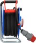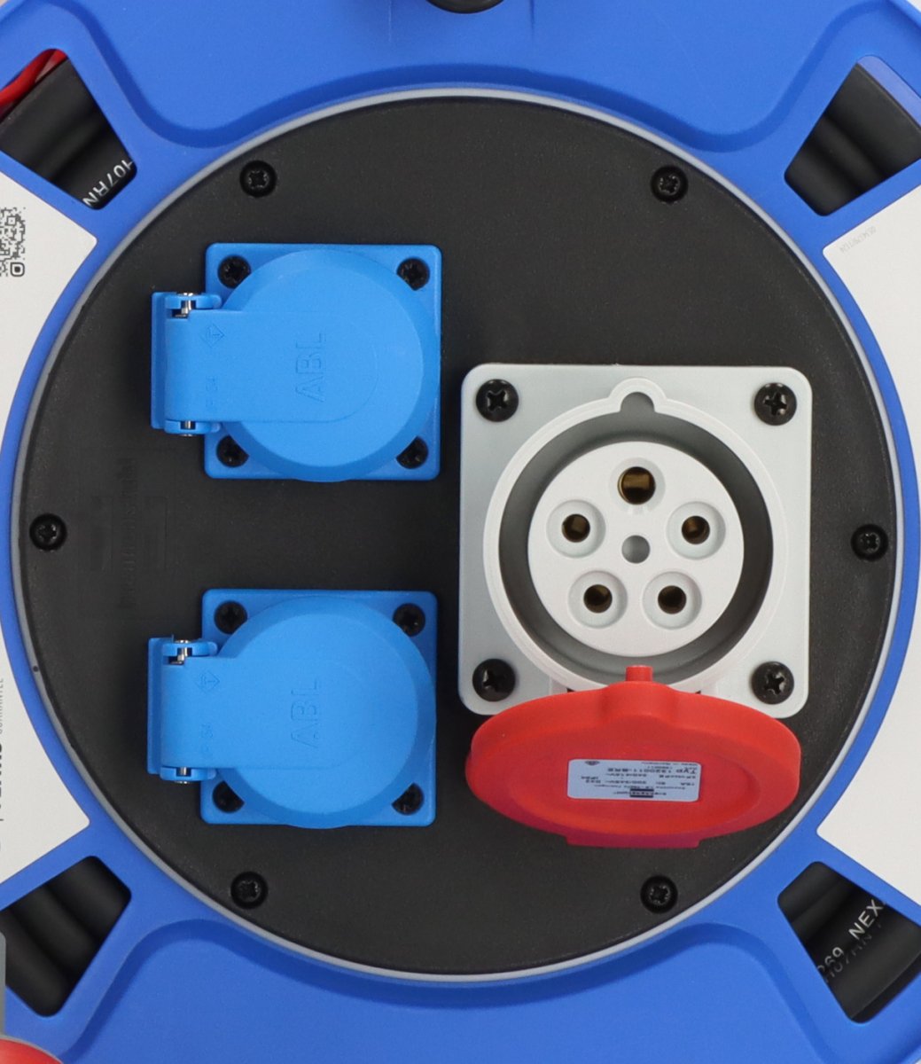 - Kabeltrommel mit CEE-Stecker 400V/16A, 1 CEE-Steckdose 400V/16A, 2 spritzwassergeschützte Schutzkontakt-Steckdosen 230V