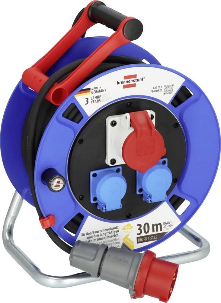 - Kabeltrommel 30m mit 3-poliger Sicherheitsabschaltung, Schutzkontakt-Steckdosen auf getrennten Phasen verteilt