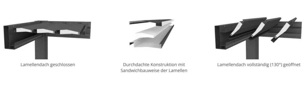 Hochwertig. Modern. Komfort bei jedem Wetter dank innovativer Sandwichbauweise für deutlich verminderte Geräuschkulisse und Wärmeabstrahlung vom Dach. Eine Wohlfühloase für jeden Außenbereich, erweiterbar mit LED-Beleuchtung, Sonnenschutzrollo und verstellbarer Lamellenseitenwand für mehr Privatsphäre.