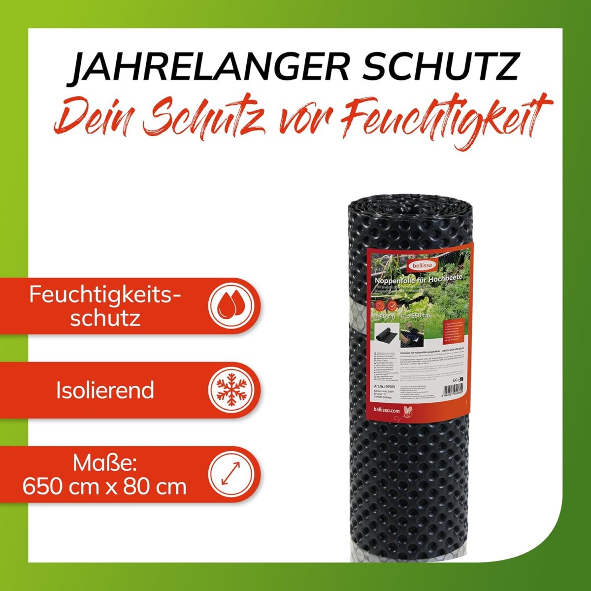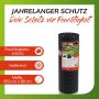 Durch die Anwendung der Noppenfolie in Schadstoffgeprüfter, professioneller, schwerer Gärtnerqualität hältst Du Schmutz und Feuchtigkeit fern und unterbindest z.B. den Zersetzungsprozess von Holz das ohne Schutz anfängt nach spätestens ein bis zwei Jahren zu Verrotten.