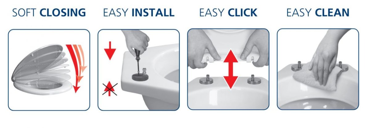 Der Sitz ist aus langlebigem Duroplast gefertigt und hochwertig bedruckt. Die praktischen Zusatzfunktionen erleichtern Ihren Alltag. So verfügt der Sitz selbstverständlich über eine Absenkautomatik, lässt sich bequem von oben montieren und dank des Easy-Click Systems zu reinigungszwecken blitzschnell abnehmen. Alle Metallteile bestehen aus rostfreiem Edelstahl.