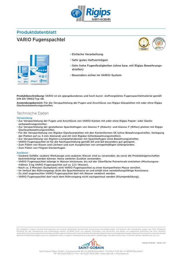 - Der VARIO Fugenspachtel von Rigips ist für die Verspachtelung der Fugen und Anschlüsse von Rigips-Gipsplatten.