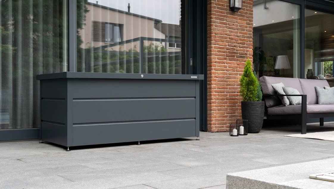 Hochwertiger Stauraum für Balkon und Garten. Dank des Stahlblechs mit hochwertiger Coil-Coating-Beschichtung ist die Juno-Gartenbox besonders langlebig und sowohl witterungs- als auch schimmelresistent.
