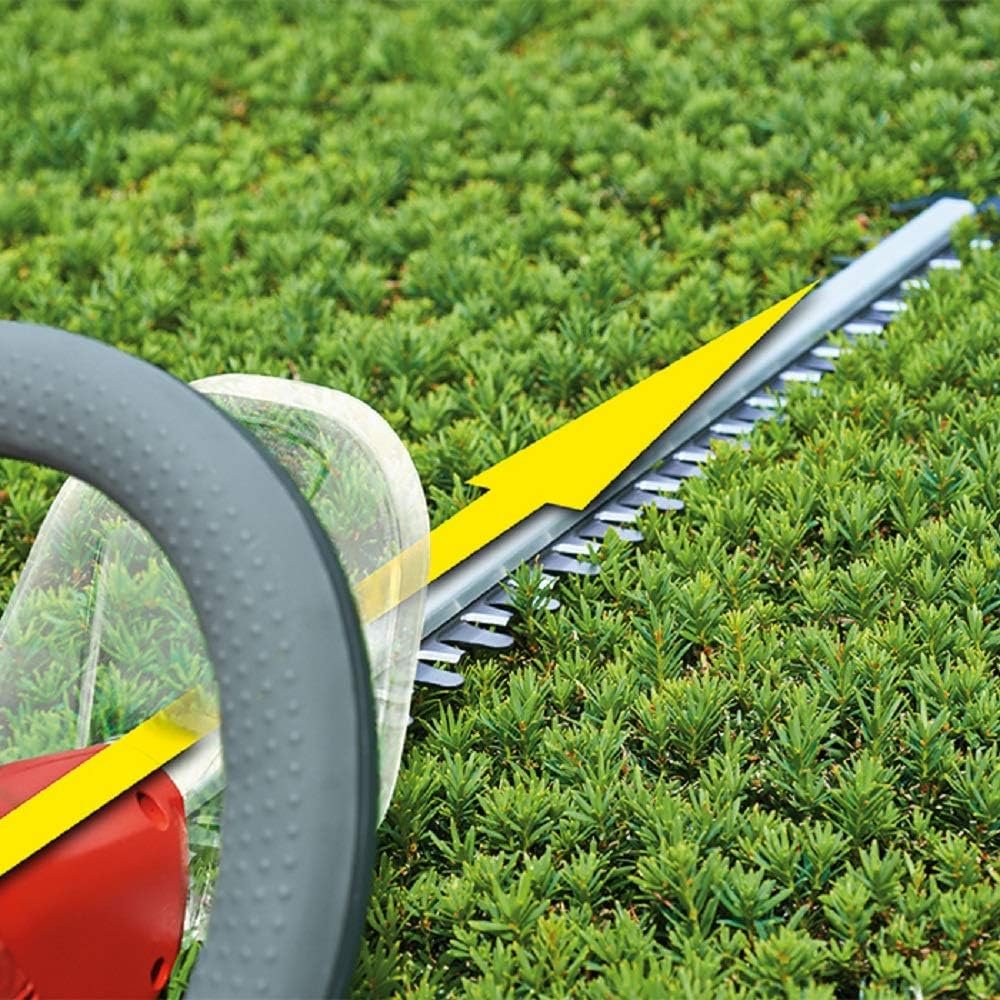 Die 55 cm lange Schneide zeichnet sich durch qualitativ hochwertige, lasergestanzte und diamantgeschliffene, gegenläufige Messer aus, die besonders langlebig sind. Für einen maximalen Bedienkomfort sorgen der Zwei-Hand-Bügelgriff und der um 180° drehbare Schneidkopf, durch den die Handhaltung bei vertikalen und horizontalen Schnittarbeiten nicht verändert werden muss.