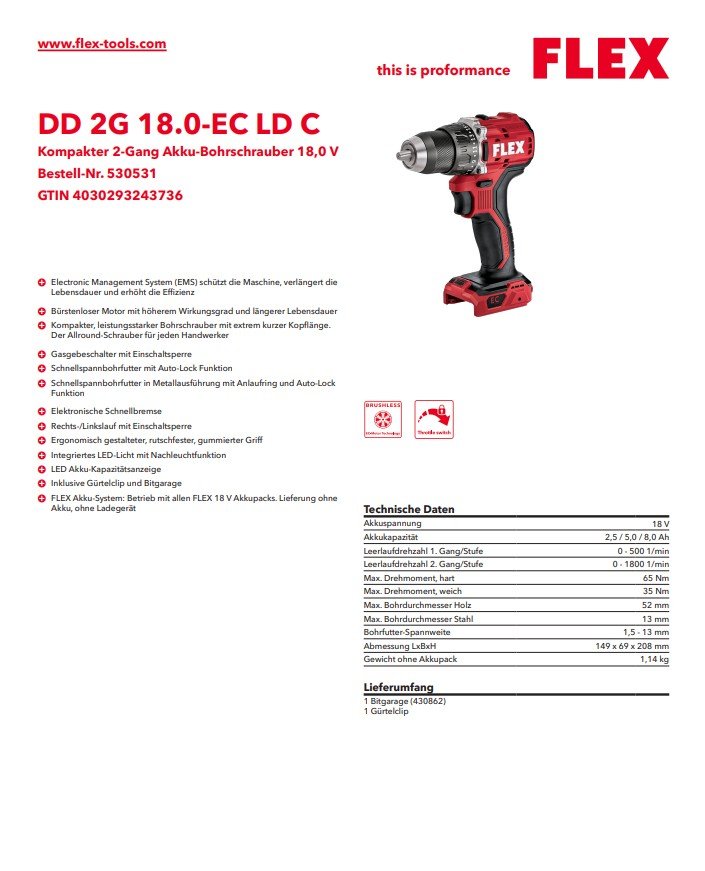 Shop » Detailansicht FLEX 18 Volt 2-Gang Akku-Bohrschrauber DD 2G 18.0-EC LD C