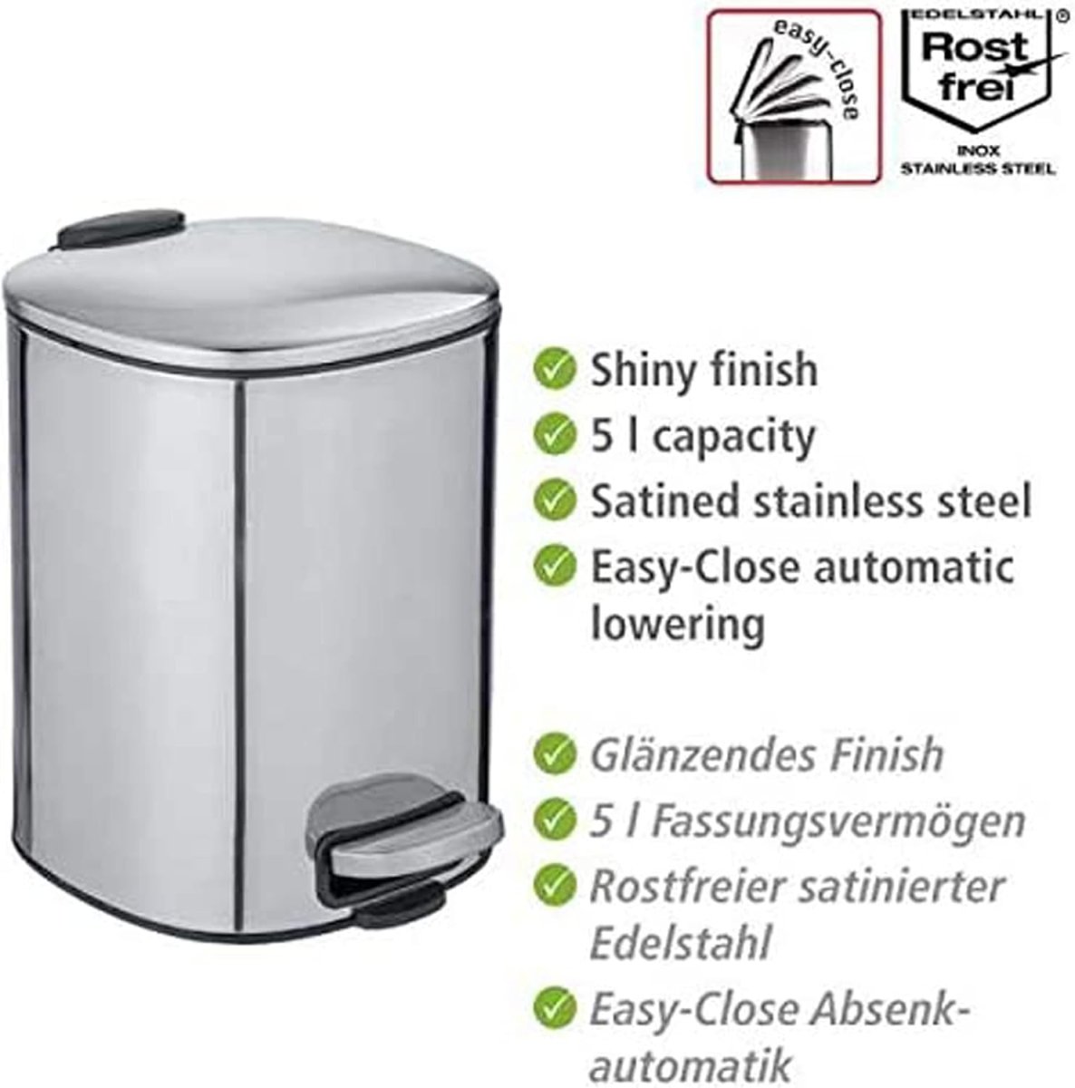- Praktische Pedalfunktion zum einfachen und hygienischen Öffnen des Eimers