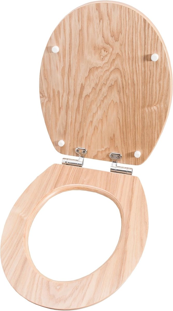 Als besonders praktisch erweist sich zusätzlich die integrierte Soft-Close Absenkautomatik: Ein leichtes Antippen des Deckels genügt und schon schließt er sanft und leise. Das minimiert nicht nur das Verletzungsrisiko für Kinder, sondern sorgt ebenfalls für eine behutsame und schonende Anwendung. Dabei besticht das Modell durch seine natürliche und dennoch edle Holz-Optik und bringt damit ein kleines Stück Natur in Ihr Badezimmer.