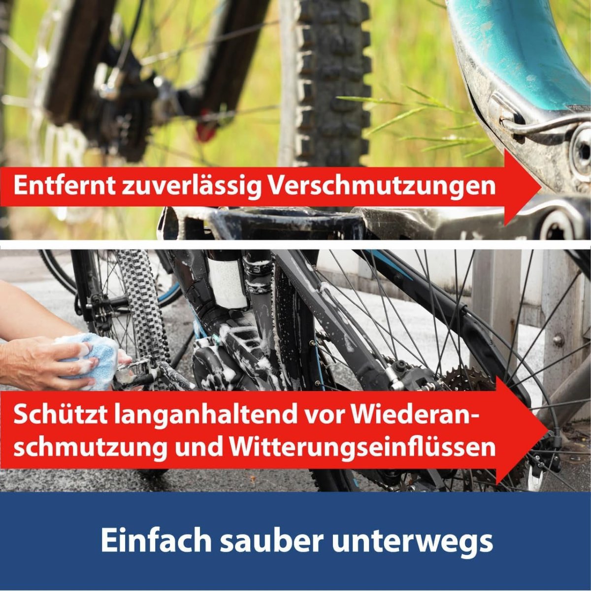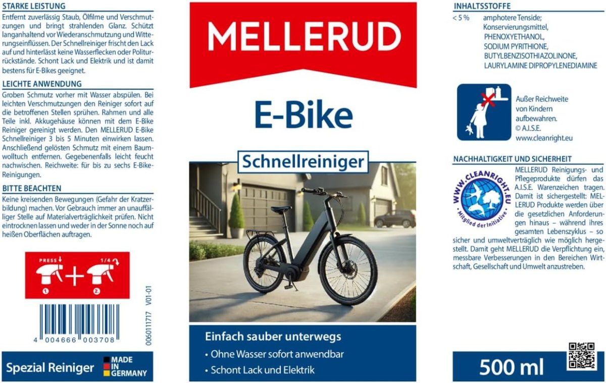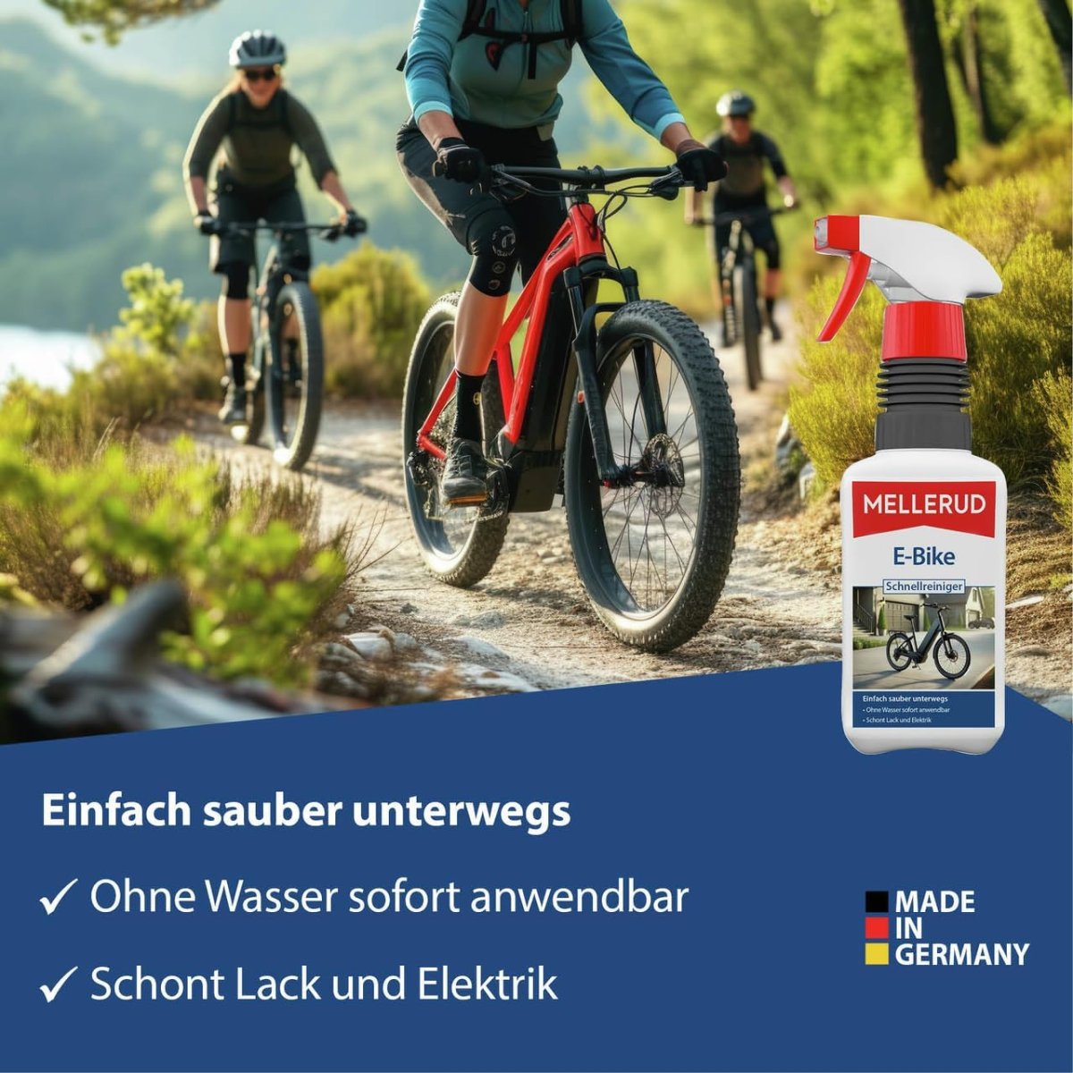 Ein hochwertiges E-Bike zu reinigen und pflegen ist eine ganz neue Herausforderung, der Sie mit dem MELLERUD E-Bike Schnellreiniger bestens gewappnet sind. Ohne die Garantie Ihres Fahrrads zu gefährden, säubern Sie es mit dem Schnellreiniger komplett ohne Wasser. Diese Art der Reinigung in Kombination mit der handlichen Größe eröffnet völlig neue Möglichkeiten für die Reinigung unterwegs - sei es nach einer langen Trekkingtour oder einer aufregenden Downhill-Fahrt über Stock und Stein. Der MELLERUD E-Bike Schnellreiniger beseitigt dabei tiefenwirksam Ölfilme, Schmutzanhaftungen und Dreck. Er verleiht Ihrem Rad den gebührenden Glanz und hinterlässt eine farbauffrischende Schutzschicht, die vor Wiederanschmutzung und Witterungseinflüssen schützt. Gleichzeitig ist die Rezeptur auf die Reinigung Ihres Elektro-Bikes zugeschnitten - Lack, Elektrik und Kontaktstellen werden geschont, was der Lebensdauer zugute kommt.