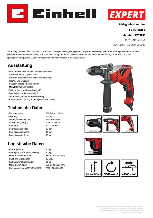 Die Schlagbohrmaschine TE-ID 650 E ist ein hochwertiges, leistungsfähiges und kompaktes Werkzeug, das Experten-Ansprüche bei Bohr- und Schlagbohrarbeiten rund um Haus, Werkstatt und Garage erfüllt.