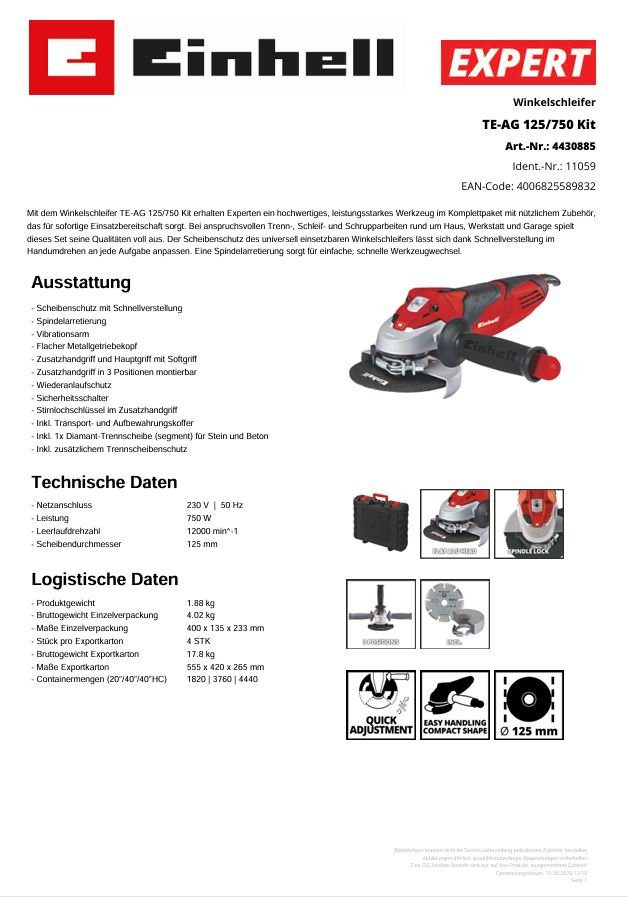 Shop » Detailansicht Winkelschleifer TE-AG 125/750 Kit