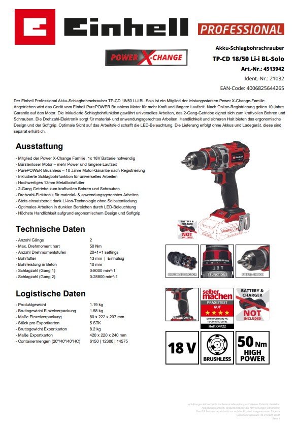 Als Mitglied der leistungsstarken Power X-Change-Familie wird der Schlagbohrschrauber von den hochwertigen Lithium-Ionen-Akkus der PXC-Reihe von Einhell angetrieben – stets einsatzbereit, ganz ohne die batterieübliche Selbstentladung. Angetrieben wird das Gerät von dem Einhell PurePOWER Brushless Motor. Dieser bürstenlose Motor bietet mehr Kraft und eine längere Laufzeit als herkömmliche Kohlebürsten-Motoren. Nach einer Online-Registrierung gelten 10 Jahre Garantie auf den Brushless-Motor.