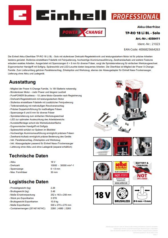 Akku-Oberfräse - Kraftvoll und langlebig - Einhell PurePOWER Brushless Motor - Art.Nr.: 4350411 Artikel-Nr.: 85000422 Hersteller: Einhell Germany AG