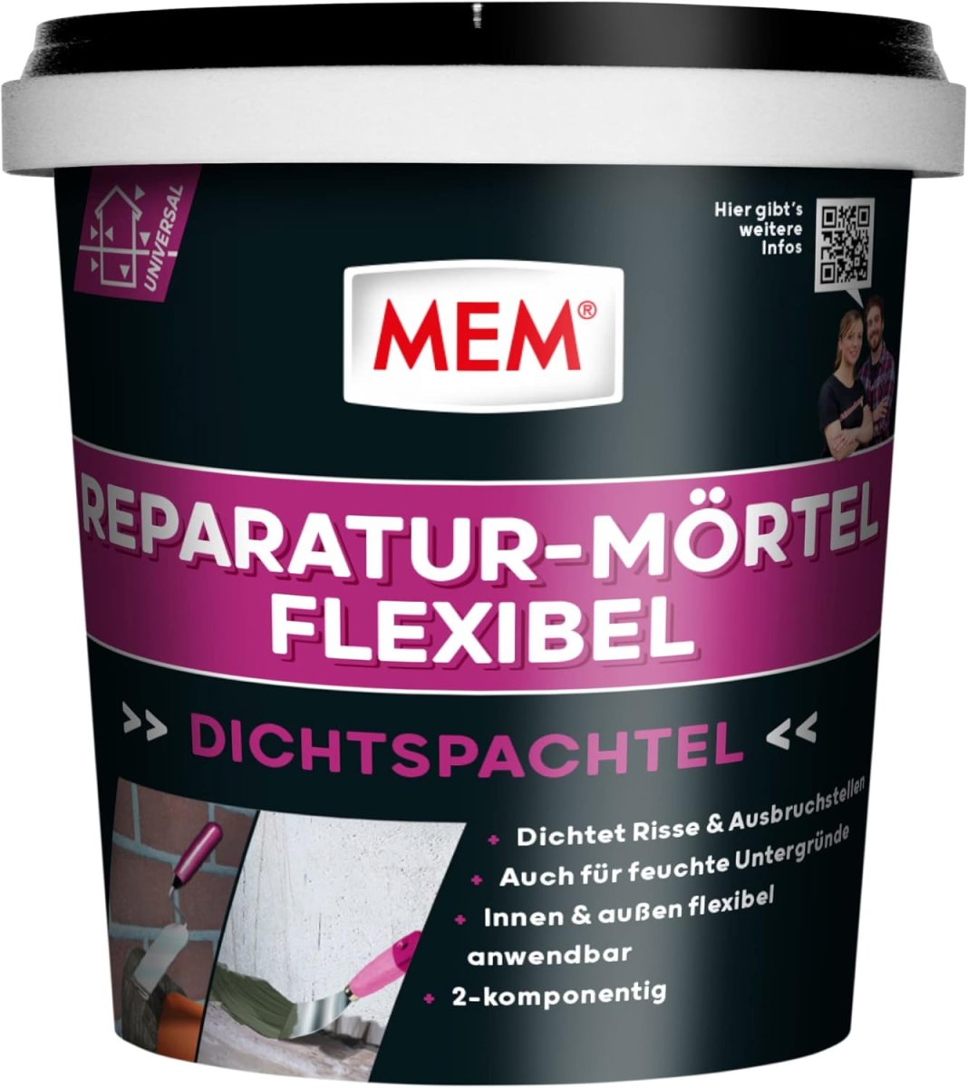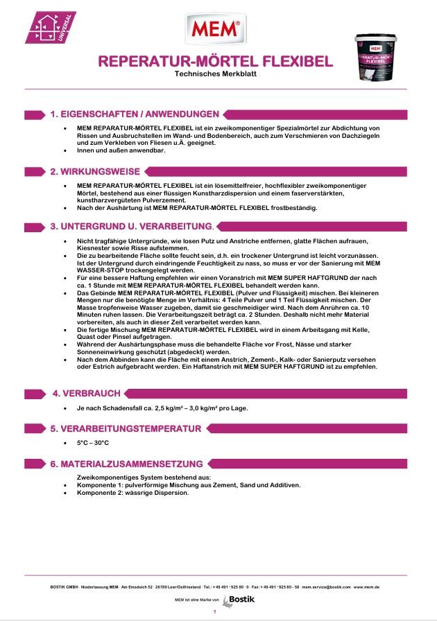 MEM REPARATUR-MÖRTEL FELXIBEL (MEM Gummi-Mörtel) dichtet Risse und Ausbruchstellen im Wand- und Bodenbereich ab. Dabei ist der Mörtel auch auf kritischen Untergründen wie Kunststoffe, Beton, Mauerwerk, Dachziegeln, Eternit, Stein, Estrich etc. anwendbar.