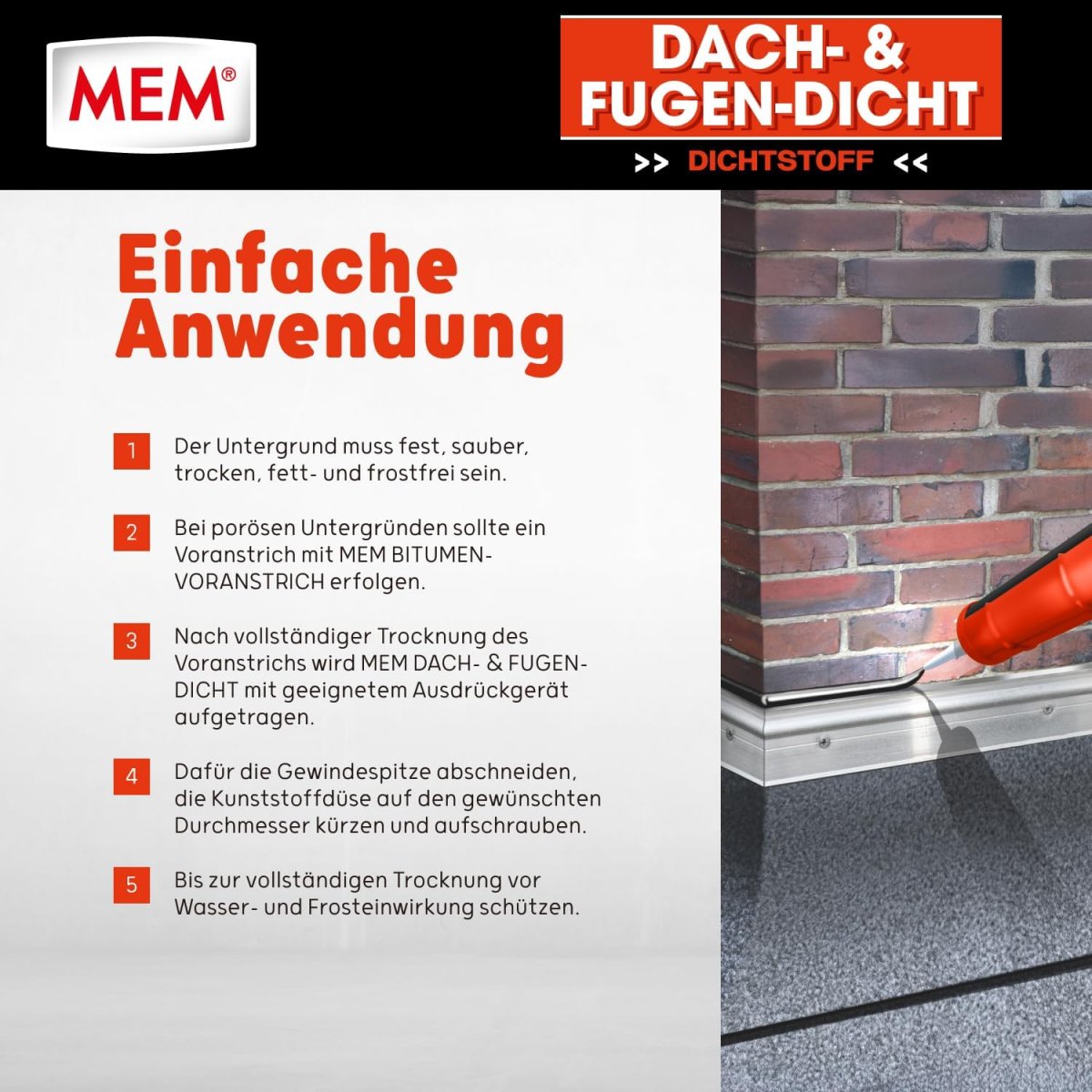MEM DACH- & FUGEN-DICHT ist für Anschlussfugen im Außenbereich anzuwenden. Bei porösem Untergrund empfiehlt sich eine Grundierung mit MEM BITUMEN-VORANSTRICH.