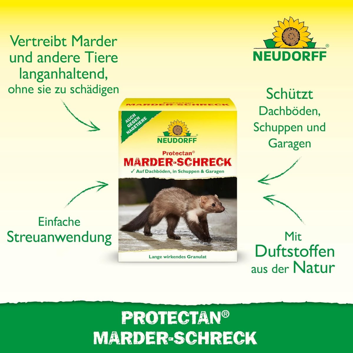 Marder-Schreck vertreibt die Tiere wirkungsvoll von Dachböden, aus Gartenhäusern, Schuppen und Garagen, ohne sie zu schädigen. Die Schutzdauer beträgt je nach Witterung 7 Wochen. Das Pulver kann in Wasser gelöst gesprüht oder als Streuanwendung auf belaufenen Flächen ausgestreut werden.