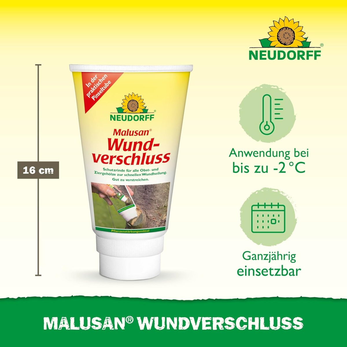 Malusan Wundverschluss tropft nicht und bildet nach dem Antrocknen einen gleichmäßigen, haltbaren und unauffälligen Belag von hoher Elastizität. Malusan Wundverschluss kann auch bei leichtem Frost (bis -2 °C) verstrichen werden.
