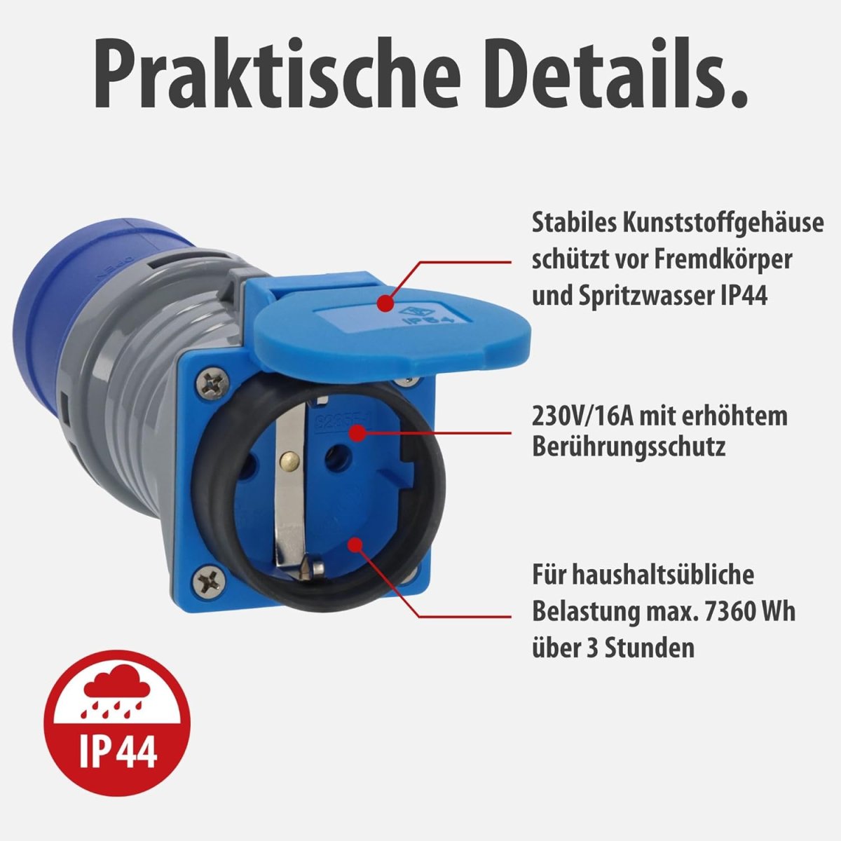 - Lieferumfang: 1x CEE-Adapter 230V/16A IP44 auf Schutzkontakt