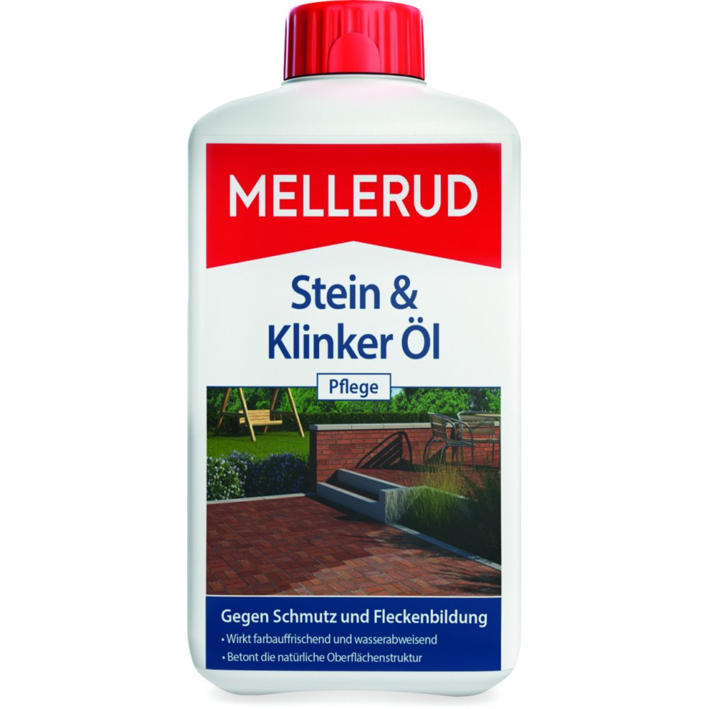 Die MELLERUD Stein und Klinker Öl Pflege ist ein anwendungsfertiges Spezial-Öl, welches Sie auf Ihren Oberflächen aus unglasierten Keramik-Bodenplatten, Tonplatten, Ziegel und Klinker, Schiefer, Trockenpressplatten, Cottofliesen und Basalt im Innen- und Außenbereich anwenden können, um diese saisonal vor Verwitterung, Schmutz und Fleckenbildung zu schützen.
