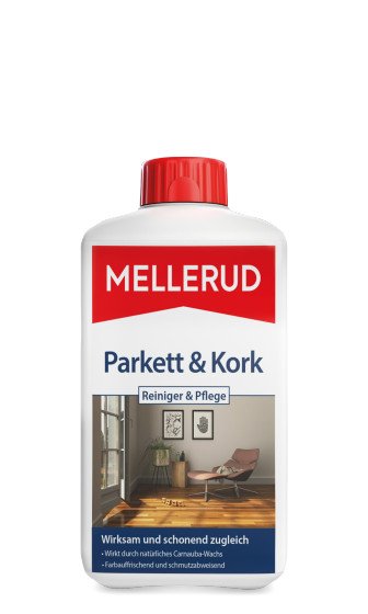 Unser MELLERUD Parkett & Kork Reiniger & Pflege ist ein Spezial-Reiniger für versiegelte und gewachste Parkett-, Holz- und Korkböden.