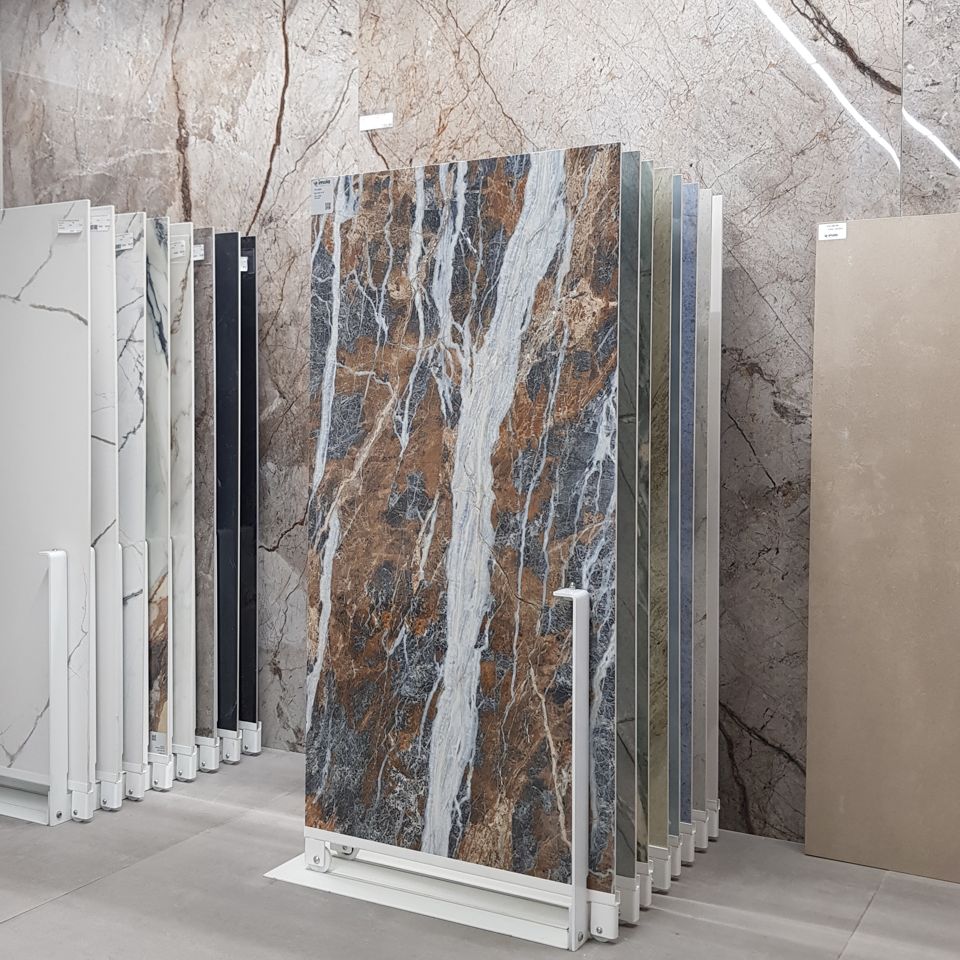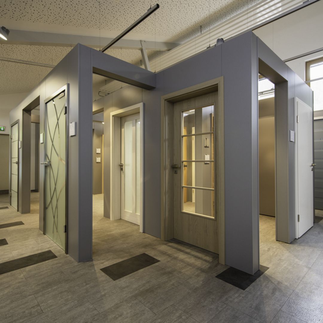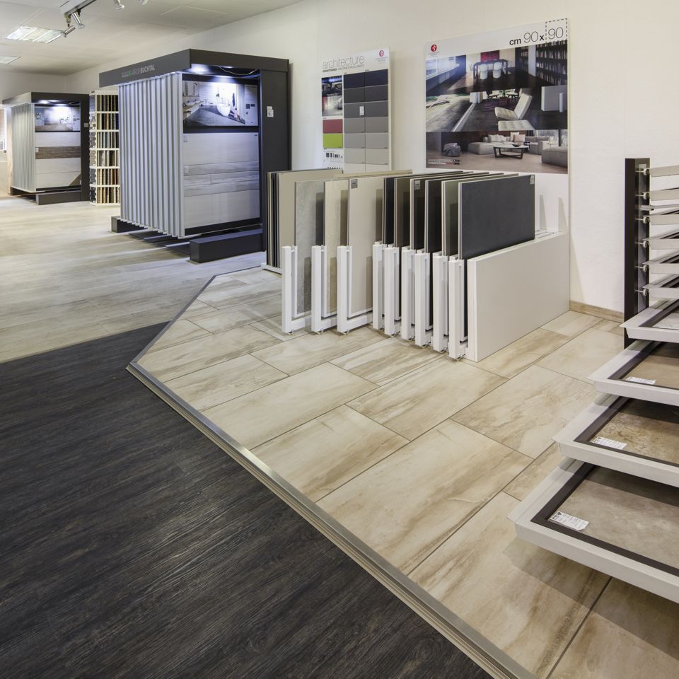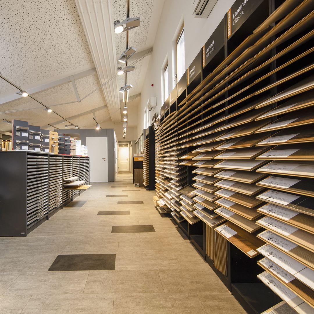 Große Fliesen- und Sanitärausstellung. Große Fachabteilung für Fenster, Türen und Bodenbeläge.